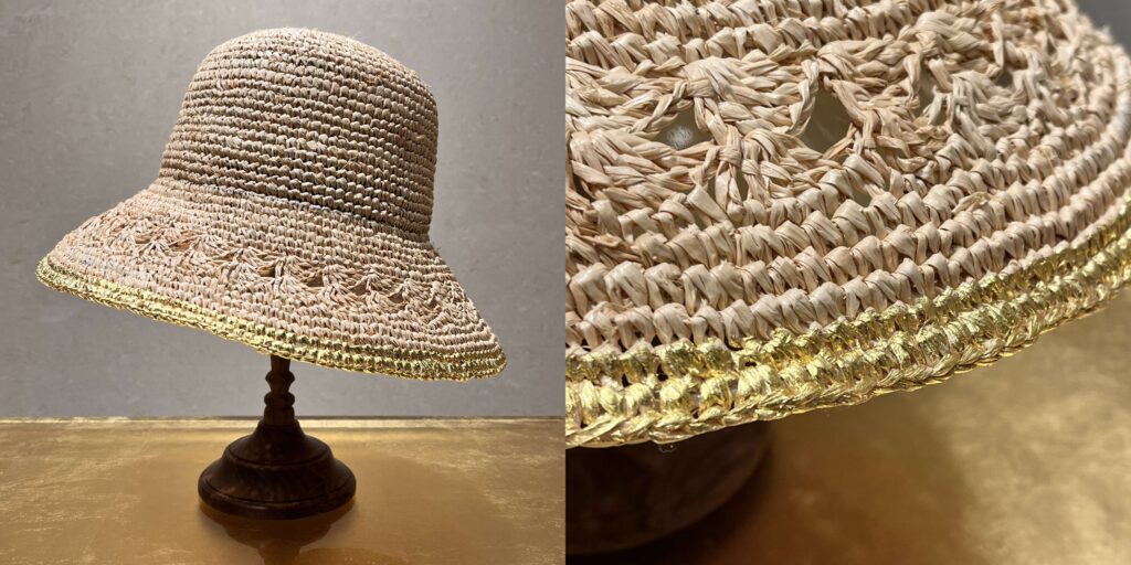 ブリムにぐるりと施された金箔のラインと、透かし編みがポイントです。
